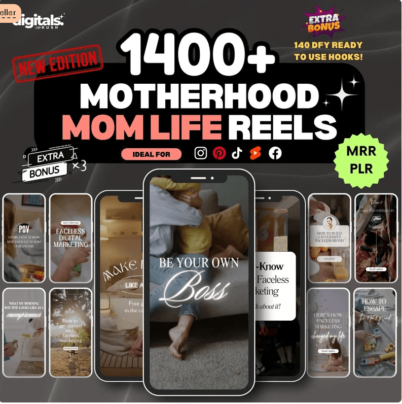 Plus de 1400 bobines pour la maternité bobines sans visage La vie de maman est faite pour vous Crochets PLR MRR Digital Bundle Master Droits de revente DFY Modèles de vidéos Canva